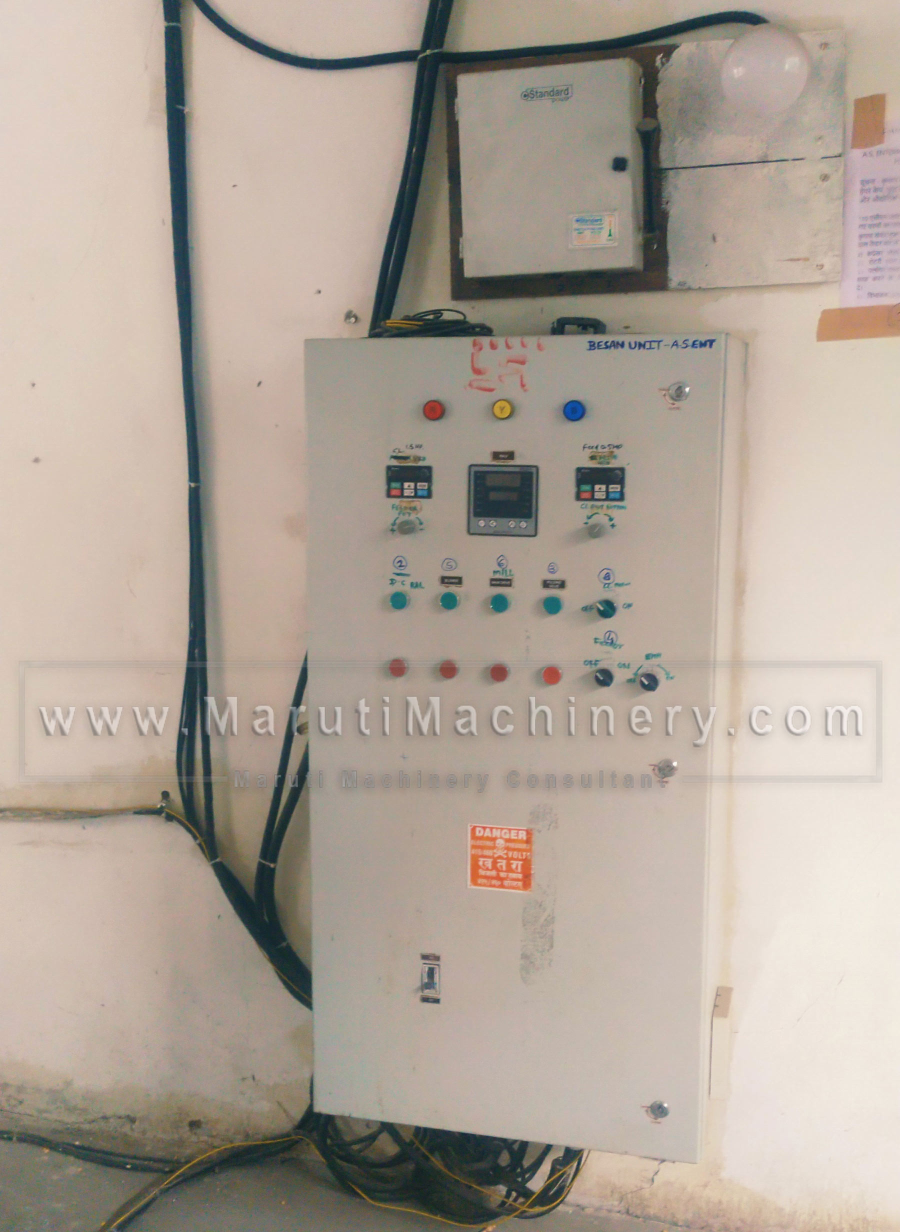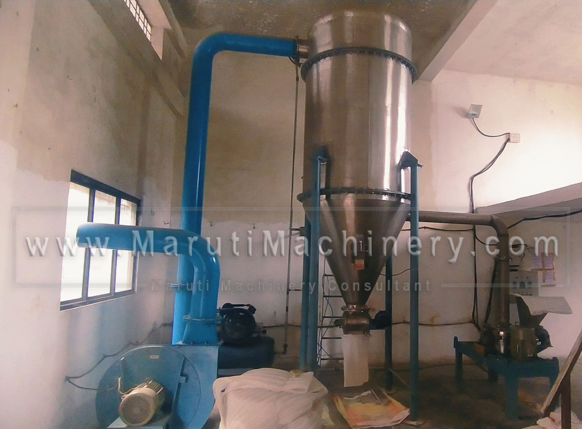 1) Main Grinding Mill -SS304 With Feeder SS304 with All Crompton & Bonfiglioli Feeding Motor. 2) SS 304 Piping and Flanges Std. with Gaskets 3) RAL - SS304/316. with 0.5 HP Motor for Material Discharge. 4) Dust Collector- SS 304, 6-7 Feet Height. Air Solenoid Valve 05 Nos with 25 Nos. Dust Collector Bags inside. 5) Electro Magnetic Hammers-02 Nos. For Impact on Hopper for Material Discharge. 6) Centrifugal Blower for Material Conveying-7.5 HP CGL. 7) MS Piping for Clean Air Conveying in Atmosphere. 8) C.P. Compressor -5 HP, Pressure Upto-12-12 psi. 9) Std. industrial Vibro Sieve SS 304. Capacity- 130-150 kg. 10) Revo Hand Bag Closer Machine for Bag Sewing- Double Stitch. 11) Weight Machine 150 Kg. 12) Suitable Control Panel for plant Operating- each button for individual Drive with VFD.